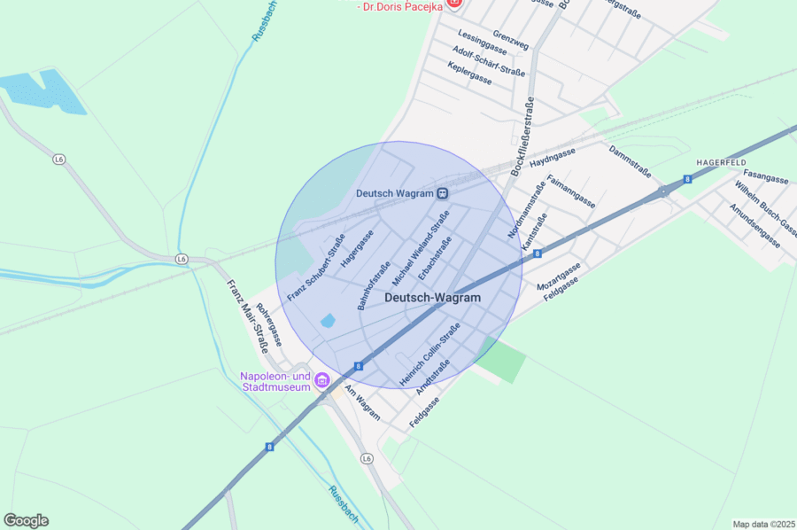 Hervorragende Zug- und Schnellbahnverbindungen am Bahnhof Deutsch-Wagram in ca. 220 m Entfernung.